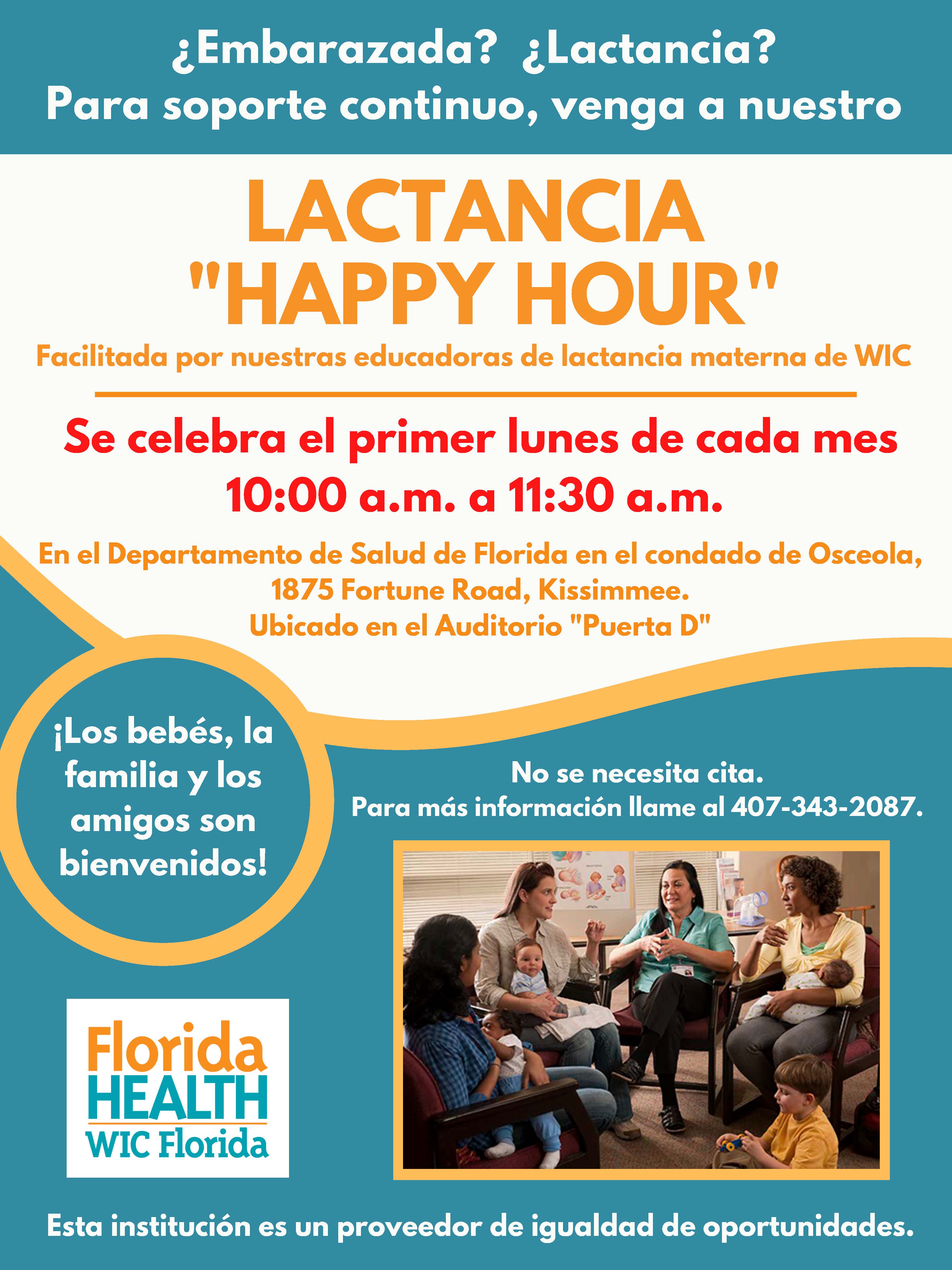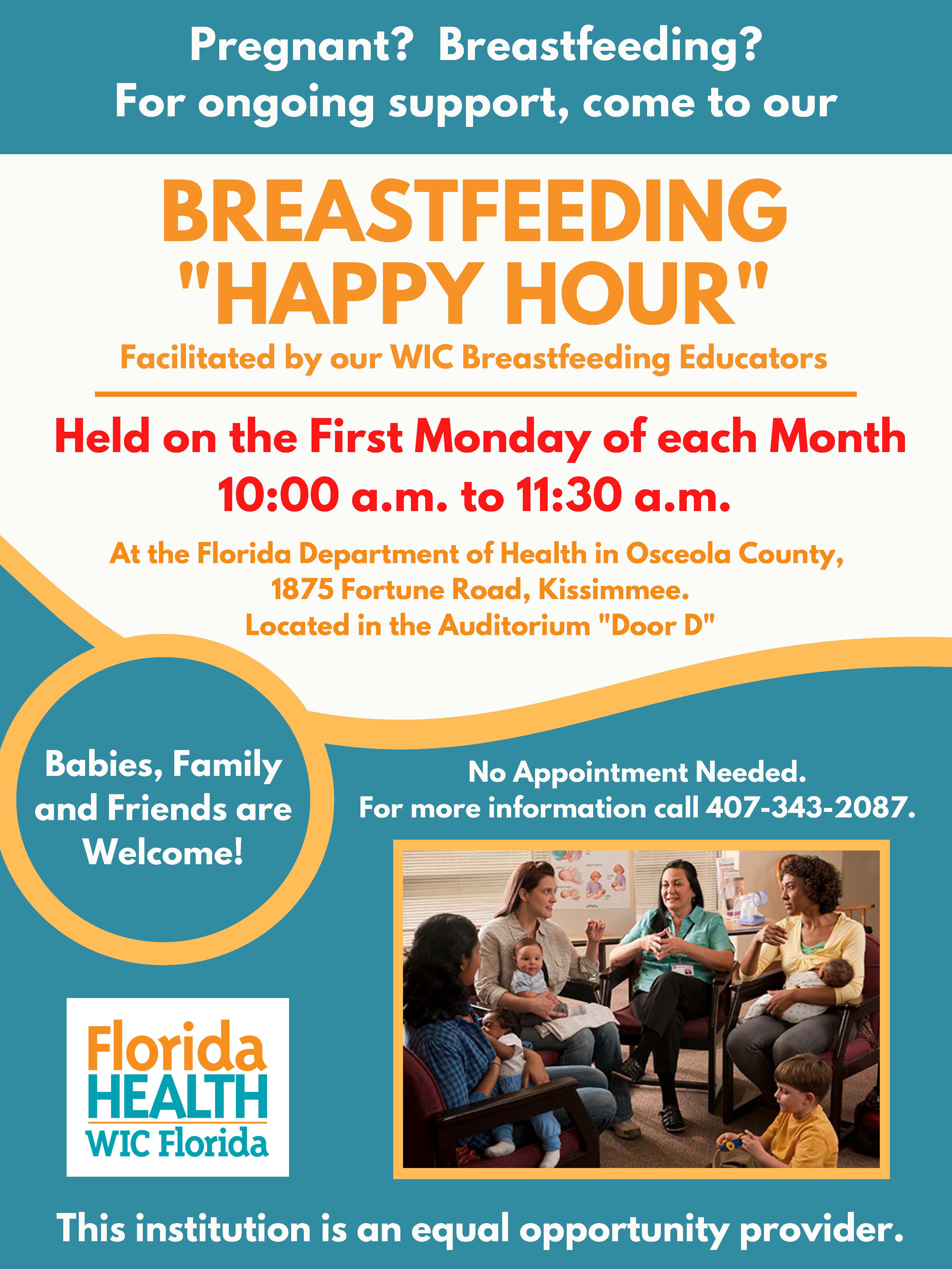 The Breastfeeding “Happy Hour” is held on the first Monday of the month between 10:00 am and 11:30 am at the Kissimmee WIC office.
